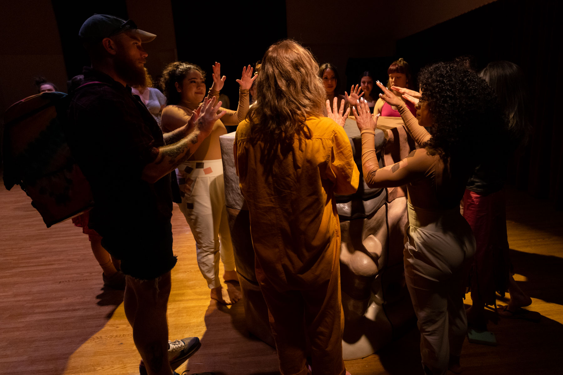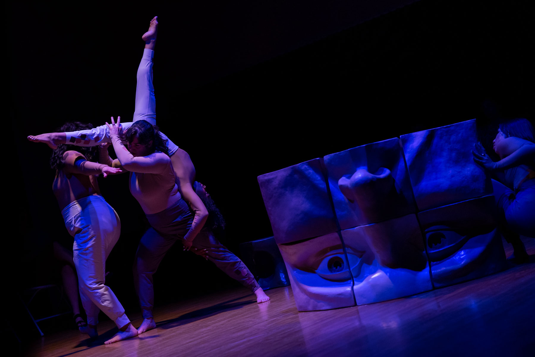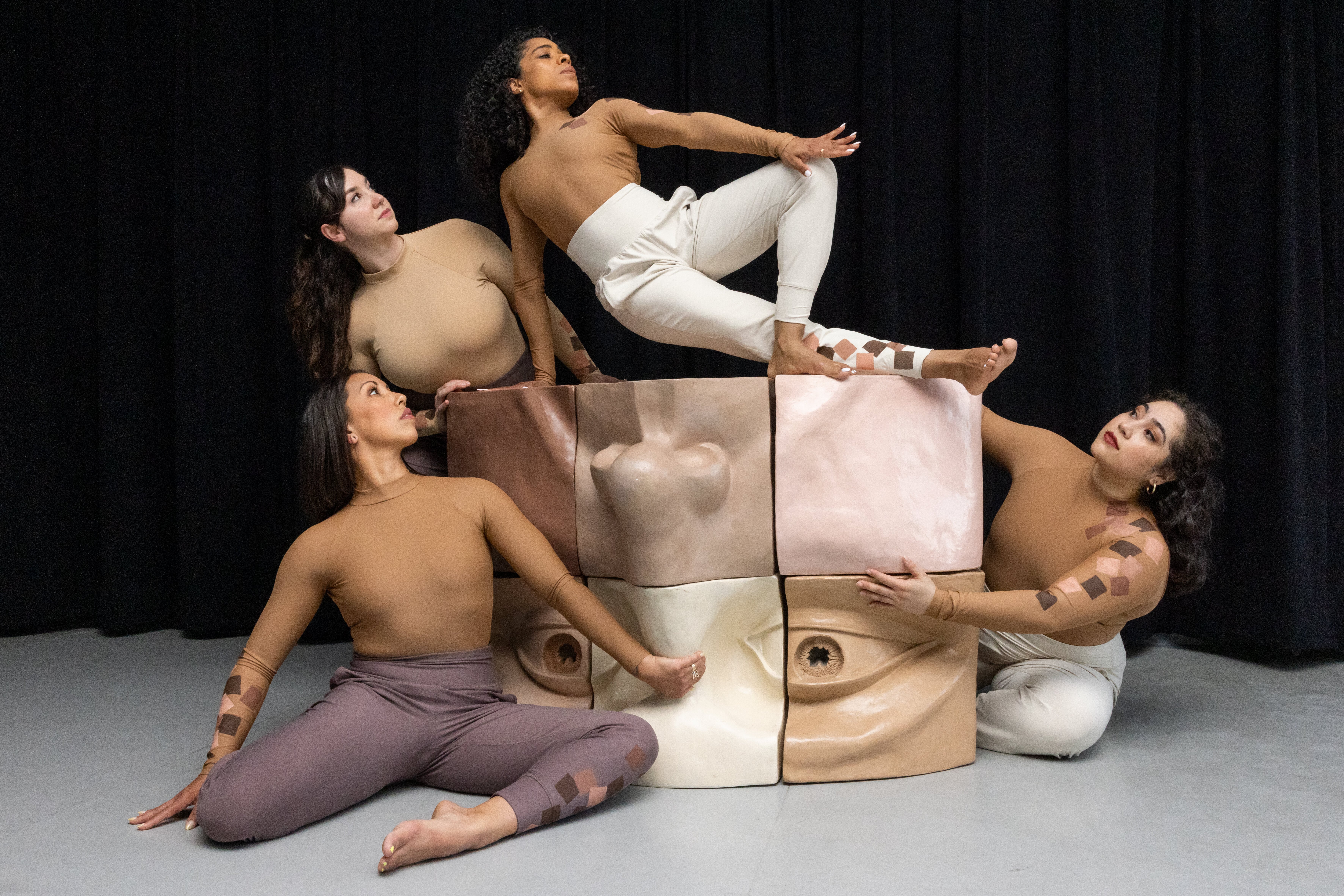 Not Eye, Us is an immersive dance-theater work exploring the intersection of gaze and power through a multi-layered connection to Michael Alfano’s sculpture ‘Cubed’. Through manipulation of the sculpture’s nine moveable pieces, each pigmented with a different skin tone, Not Eye, Us examines individual diversity within a united community; propelling the audience and performers on an interactive journey.